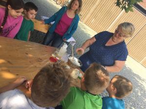 Bei schönstem Ferienwetter konnten wir insgesamt 27 Kinder auf dem Hof der Ampferl's begrüßen. Nachdem Margot eine kurze Erklärung zu den Zutaten des Brotteiges gab, erklärte Otto ausführlich die verschiedenen Getreidesorten.