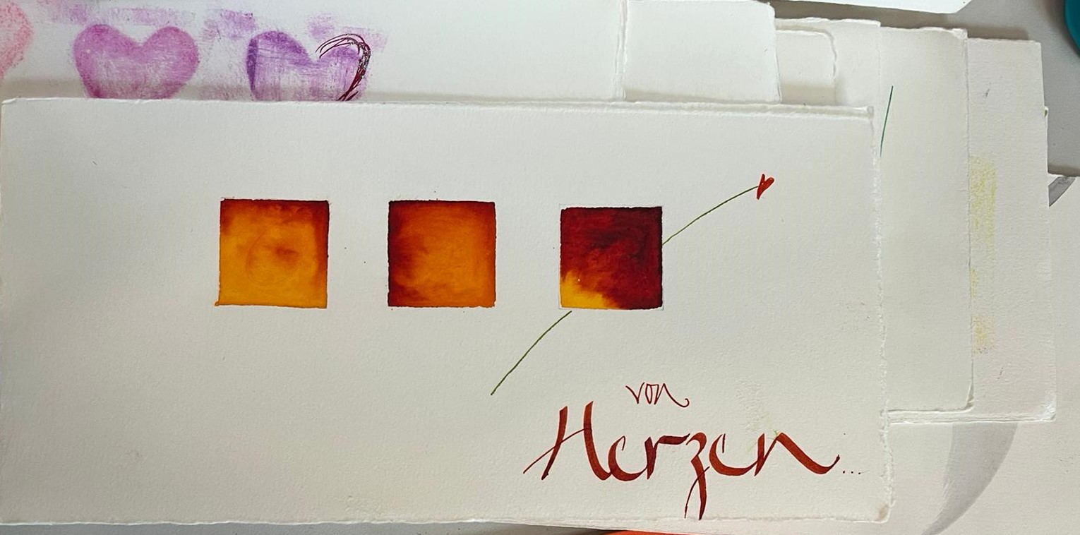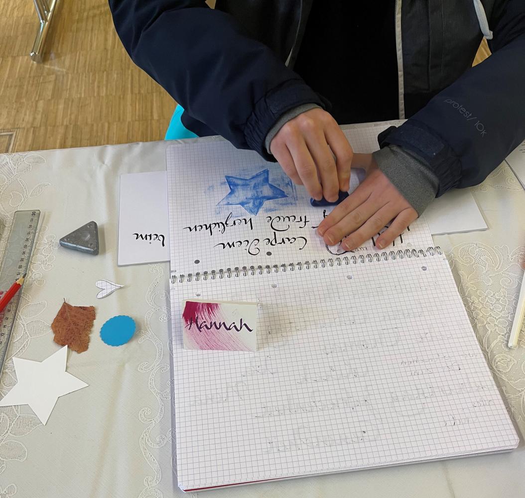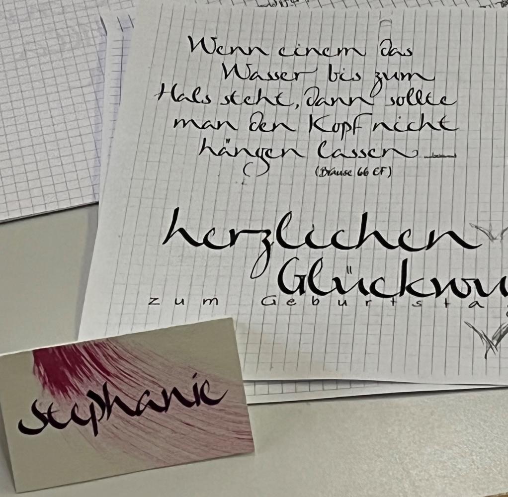 Nach Anleitung von Andrea Paulus erlernten wir die einzelnen Buchstaben kalligraphisch zu schreiben. Innerhalb kurzer Zeit wurden Karten und andere Kunstwerke von uns gestaltet.