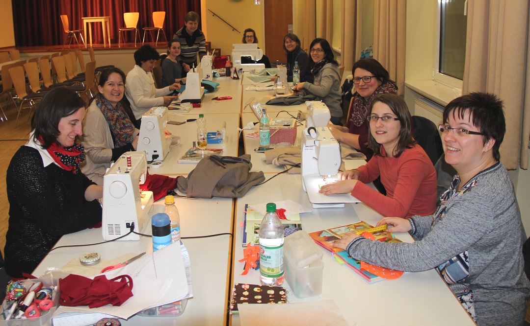 Unter Anleitung von Fine Gerl fand an sieben Abenden ein Nähkurs im Pfarrsaal statt. Hergestellt wurden verschiedene Kleidungsstücke, wie Mantel, Tunikakleid und ein Loop-Schal, sowie Taschen, Beutel und Kissenhüllen. Im Bild oben die Teilnehmerinnen in Aktion. Das untere Bild zeigt die ganze Gruppe mit den verschiedenen Arbeiten.